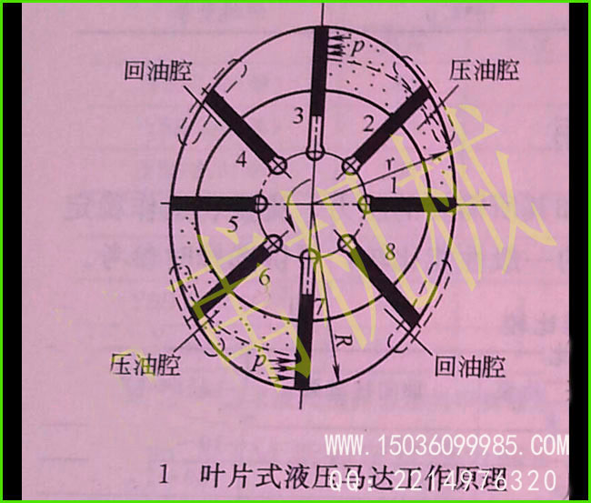 (1) 葉片馬達的工作原理如圖說所示,當壓力油經過配油窗口進入葉片1、3(或者5、7)之間時,葉片1、3一側高壓油、另一側作用低壓油,同時由于葉片3伸出的面積大于葉片1伸件時,葉片1、3一側作用高壓油另一側作用低壓油,同時由于葉片3伸出的面積大于葉片1伸出的面積,因此使轉子產生逆時針轉動的力矩。同時葉片5和7的壓力油作用面積之差也使轉子產生逆時針力矩。兩者之和即為液壓馬達產生旋轉的扭矩。在供油量一定的情況下,液壓馬達將以確定的轉速旋轉。位于壓油腔葉片2、6兩面同時受壓力油作用,受力平衡,對轉子不產生轉矩。