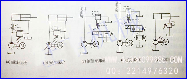 調壓溢流    系統采用定量泵供油的節流調速時,常在其進油路或回油路上設置節流閥或調速閥,使泵油的一部分進入液壓缸工作,而多余的油需經溢流閥流回油箱。溢流閥處于其調定壓力下的常開狀態,調節彈簧的預緊力,也就調節了系統的工作壓力。因此,在這種情況下溢流閥的作用即為溢流調壓,如圖a所示。